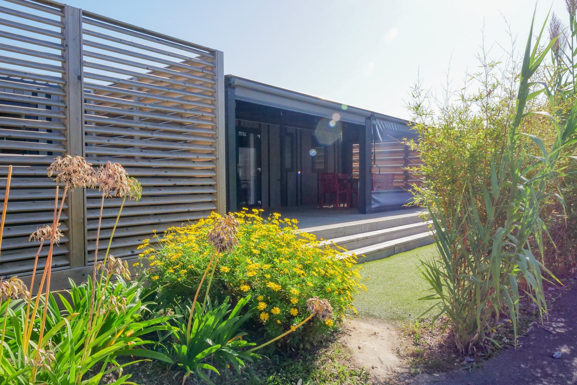 Semi-covered or ground terrace with garden furniture, sun loungers.