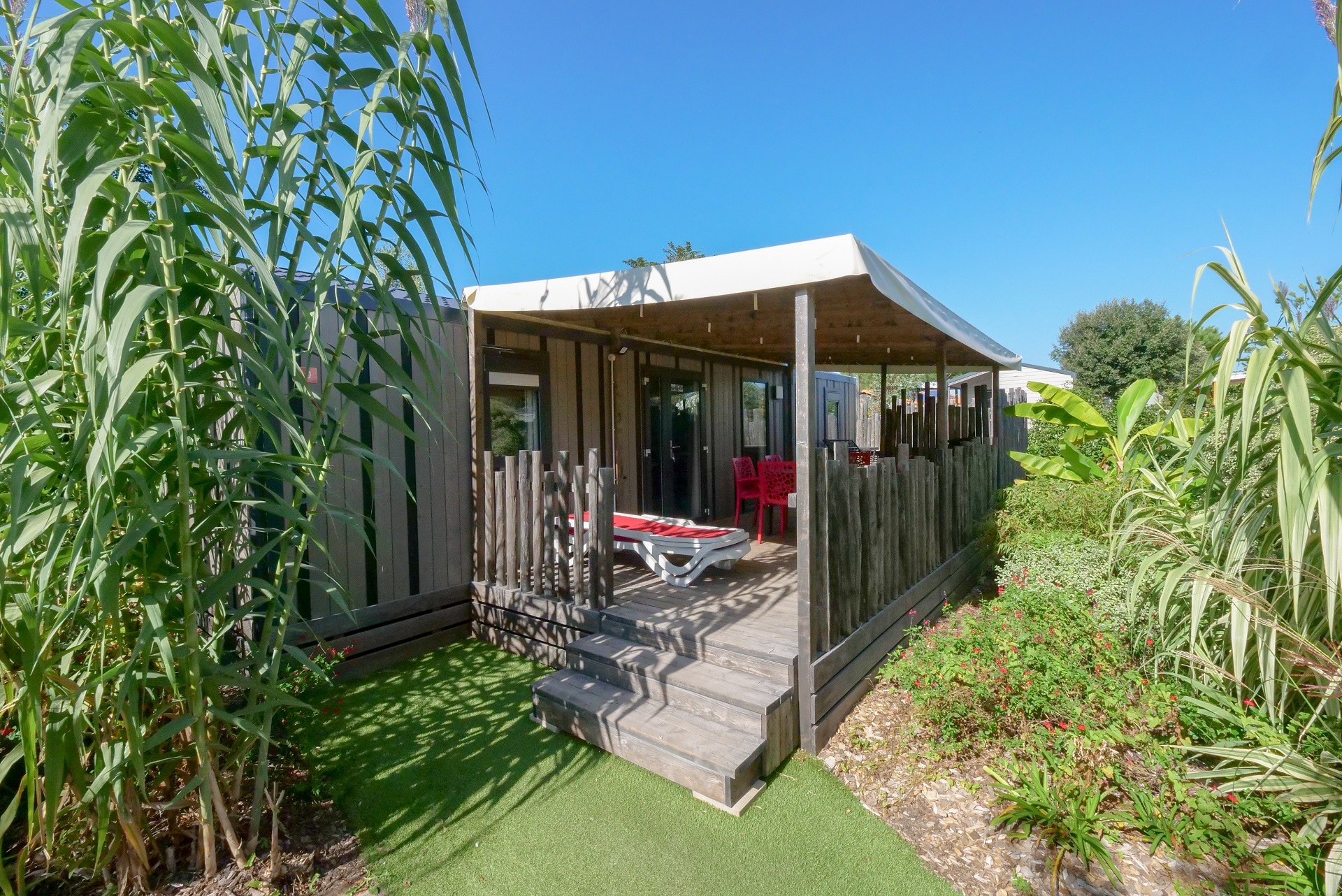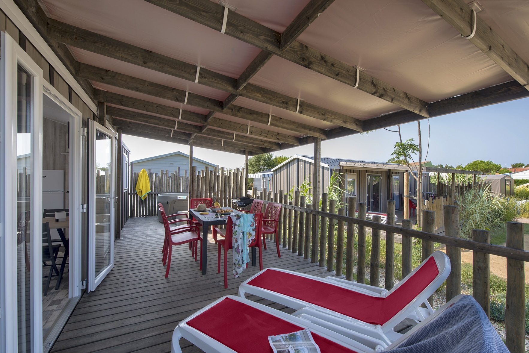 Terrasse couverte ou au sol avec salon de jardin et bains de soleil.